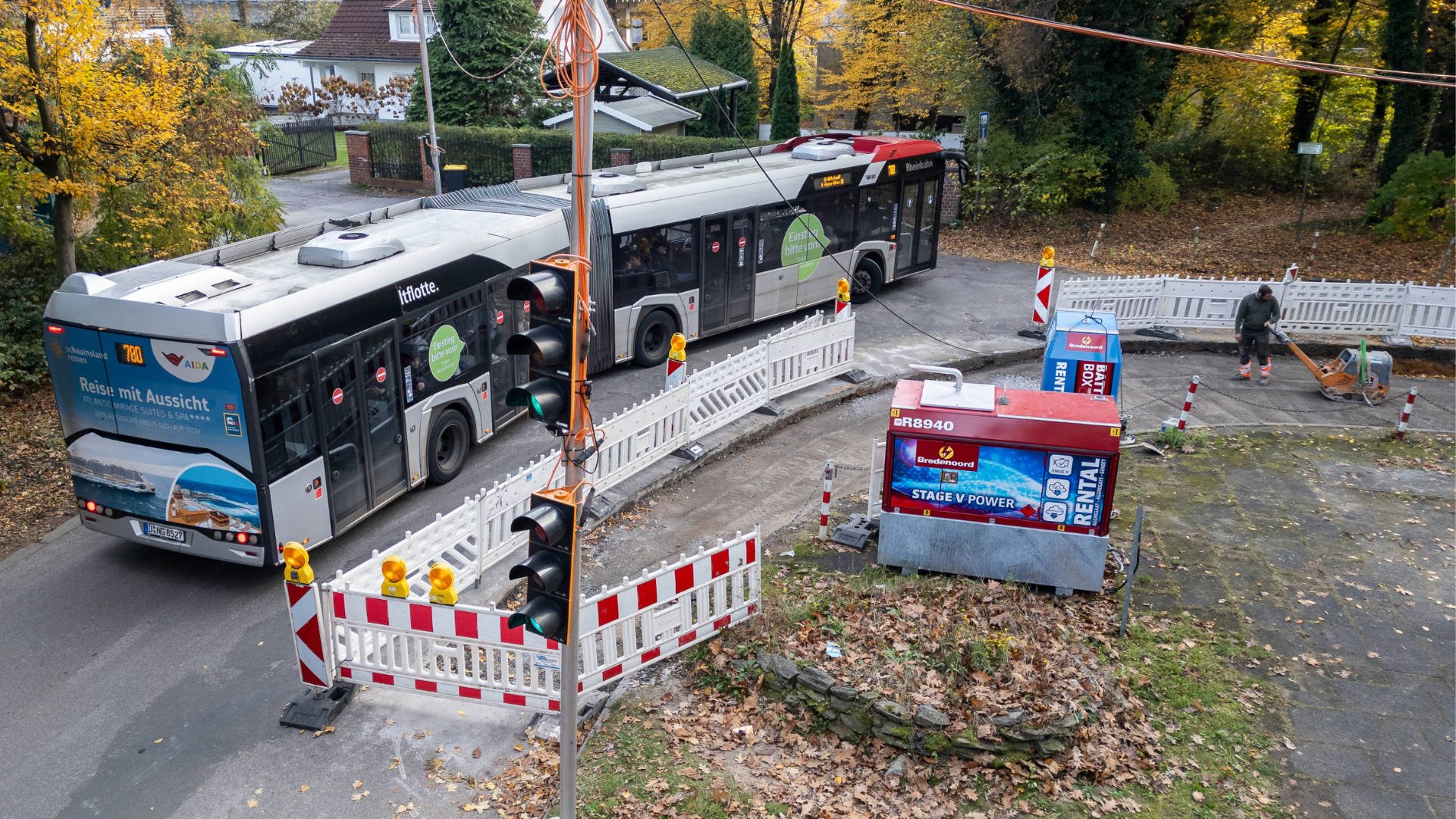 Das Bredenoord Hybrid Set versorgt eine Ampelanlage auf der Straßenbaustelle, während ein Bus vorbeifährt und ein Bauarbeiter mit Bodenarbeiten beschäftigt ist.