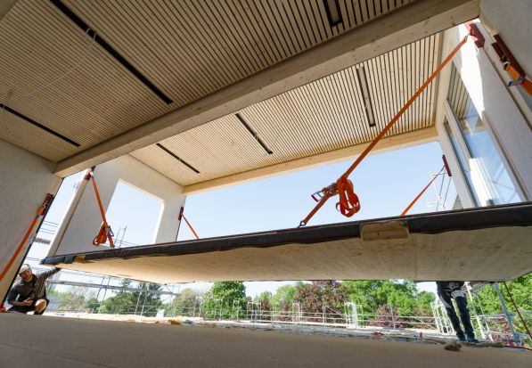 Das gesamte Gebäude besteht aus 80 vorgefertigten Holzmodulen. Hergestellt hat sie die Baumgarten GmbH im Raum Fulda. Anschließend erfolgte der Transport nach Bensheim. Für die Module kam unter anderem Kerto LVL von Metsä Wood zum Einsatz.