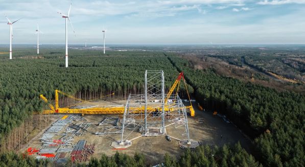 Im südbrandenburgischen Schipkau entsteht das höchste Windrad der Welt. Nach einem Baustopp im Winter sind die Arbeiten am 2. März wieder aufgenommen worden. Das Bauwerk wird bis zur Spitze seines Rotors mit 365 Metern annähernd so hoch wie der Berliner Fernsehturm sein.