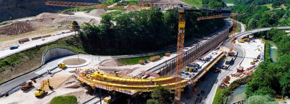 Die Längsträger von Doka UniKit weisen eine hohe Tragfähigkeit auf. „Die Tragkraft war ein wichtiger Grund für den Zuschlag“, sagt Doka-Projektleiter Stephan Kutmon. Sieben Brückenfelder von bis zu 22 Metern konnten so realisiert werden, ohne dass Zwischenunterstützungen nötig waren. „Dem Bauunternehmen spart das Zeit, Material und auch Kosten“, so Kutmon. Gleichzeitig sind die Träger schlank genug, um die vorgeschriebene lichte Höhe für die unterquerende Straßen- und Bahnverbindung jederzeit gewährleisten zu können.